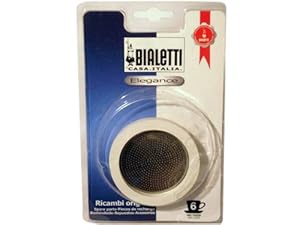 Paquet qui contient trois joints et un filtre supérieur en acier inox pour les cafetières Bialetti en acier inox mod. Kitty et Kitty or de six tasses.